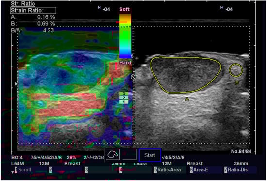 Strain elastography is a US examination which measures the stiffness of the tissues. The soft and hard tissues are color-coded differently on the strain elastogram. Usually, malignant tumors are stiffer than normal adjacent tissue, which makes them easily distinguishable. The images can be superposed and compared with those from grayscale examination [6,20].