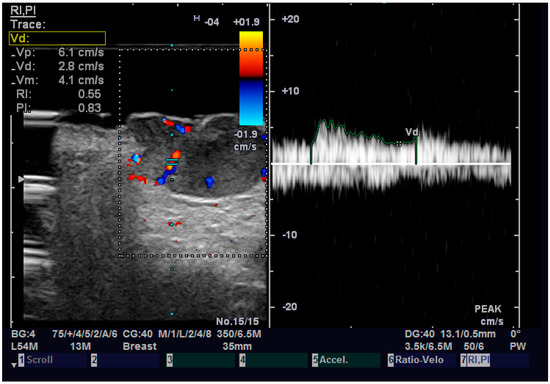 Regarding elastography, we can easily see that the tumor tissue is stiffer than the normal adjacent one (Figure 6). We did not find any significant statistical association between the value of strain ratio and the histology of the tumor. The values in the BCC group were also lower than in the SCC group (95% CI −2.98–0.35, p = 0.126). Doppler examination (Figure 7) showed increased values for both systolic and diastolic speed in the SCC group, but the results were not statistically significant and no association between the type of histology and vascularization was found (Table 4).