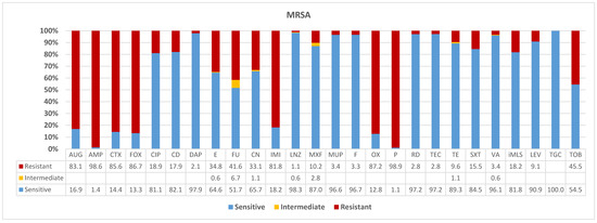 Antibiogram patterns of methicillin-resistant Staphylococcus aureus isolates recovered from clinical specimens in Ha’il region, Saudi Arabia. AUG—amoxicillin */clavulanic acid (2/1); AMP—ampicillin, CTX—cefotaxime; FOX—cefoxitin, CIP—ciprofloxacin; CD—clindamycin; DAP—daptomycin, E—erythromycin; FU—fusidic acid: CN—gentamicin; IMI—imipenem, LNZ—linezolid; MXF—moxifloxacin; MUP—mupirocin; F—Nitrofuran; OX—oxacillin; P—penicillin; RD—rifampicin; TEC—teicoplanin; TE—tetracycline; SXT—trimethoprim */sulfamethoxazole; VA—vancomycin; IMLS—inducible macrolide, lincosamide, and streptogramin; LEV—levofloxacin; TGC—tigecycline; TOB—tobramycin.