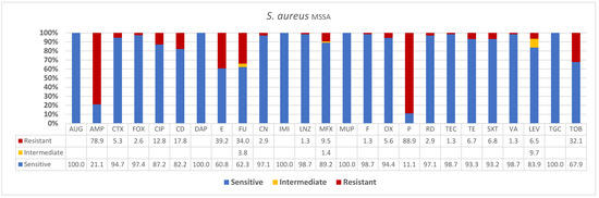 - Kanjilal, S.; Abdul Sater, M.R.; Thayer, M.; Lagoudas, G.K.; Kim, S.; Blainey, P.C.; Gradc, Y.H. Trends in Antibiotic Susceptibility in Staphylococcus aureus in Boston, Massachusetts, from 2000 to 2014. J. Clin. Microbiol. 2018, 56, e01160-17. [Google Scholar] [CrossRef]