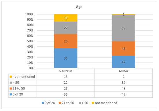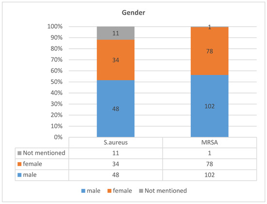 Our result depicts high prevalence of MRSA among elderly patients with underlying risks aged >50 years (32%). Past studies presented considerably variable data regarding the distribution of MRSA in varied age groups. There are ample studies from Saudi Arabia and other Middle Eastern countries that showed MRSA common occurrence in elderly patients [56,69], and this is attributed to the common risk factors including age, co-morbidities, and long hospital stays. However, the frequency of infection reported in this study among otherwise healthy and mostly young patient groups, 0–20 years (15%) and 21–48 years (17%) with no underlying risk of comorbidity or hospitalization, is consistent with established host properties of CA-MRSA [70]. These were mostly male patients harboring 37% (n = 102 of 276) of total isolates followed by female patients at 28.4% (n = 78 of 276) with the ratio of 1.3:1. This may be attributed to the local differences in more male outdoor socializations than females in addition to the lack of hygiene practice [69,71,72,73].