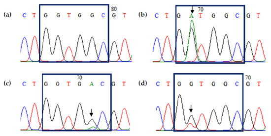 Chromatogram highlighting codons 12 and 13 of KRAS in selected cases. Arrows indicate the location of the single-point mutations. (a) Wild-type KRAS sequence (GGT GGC); (b) c.35G > A (G12D) mutation in case 4; (c) c.38G > A (G13D) mutation in case 9; (d) c.35G > T (G12V) mutation in case 12.