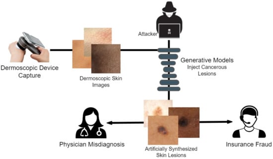 We opted to research the dermoscopic avenue of medical deepfakes, as this modality is the easiest technique for capturing skin cancer diagnosis data due to easier targeted attacks. Figure 1 illustrates how an attacker can easily manipulate healthcare and other biomedical imagery. Dermoscopic devices are standard handheld, non-invasive machines capable of capturing high-resolution skin images. Most often, skin-prone diseases are initially diagnosed by a physician from these images. Using a generative framework, a black hat expert could easily maneuver different skin cancers from mere human skin image samples. The generative model could either generate new fake lesions or transform existing non-dangerous tumors into late-stage malignant lesions. The current healthcare system is designed to provide insurance schemes based on a doctor’s diagnosis and biomedical imaging modalities as proof. Consequently, both the physician and the inspection agent at the insurance end are likely to believe the attacker’s fallacy of tampering and manipulating the medical images during the inquiry and diagnostic stages.