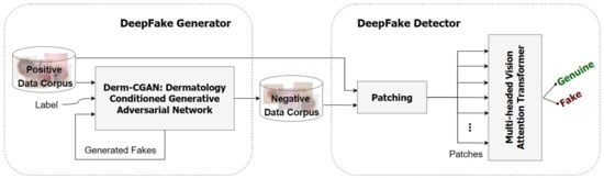 The general architecture of the proposed framework is illustrated in Figure 2. We observed a need for publicly available synthesized data in medical deepfake detection. For this reason, the Derm-CGAN was developed as a modified version of the current Conditional GAN-based image translation frameworks by training the network continuously until it reached a stable momentum generating highly realistic fake content [37]. The negative data corpus is a collection of synthesized skin lesions by Derm-CGAN. A Multi-headed Vision Attention Transformer (ViT) was then trained on the real dermoscopic conditions (positive dataset) as well as the counterfeited lesions (negative dataset). The network extracts latent representations from patches of dermoscopic images to determine if the incoming input is genuine or fraudulent.