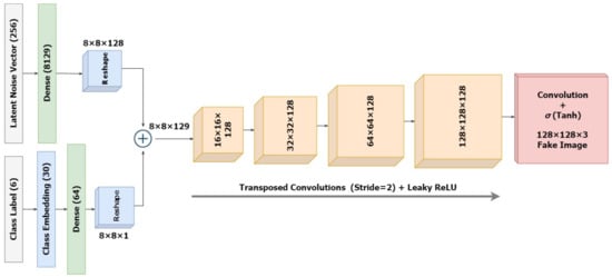 The architecture of the standalone generator model is designed as in Figure 5 that takes a latent noise vector of dimension 256 and a random label in the range [0, 5] representing the different skin lesion types. As a starting point, we reshape the latent input vector into an 8 × 8 image. For this, the latent vector is mapped to = 8129 dense nodes, which are further reshaped into 8 × 8 images with 128 feature maps. The embedding of the category label inputs results in a vector of size 64 that will eventually be reshaped into an 8 × 8 image representation to fit the dimensions for concatenation with the reshaped latent noise vector. The combined vector size of 8 × 8 × 129 is slowly upscaled to a 128 × 128 × 3 image for output. Up to the output layer, this part of the cGAN is identical to an unconditional GAN. We integrate the input label and the latent input while defining the model inputs. Unlike the discriminator, this model is not explicitly trained, and thus, it is not compiled initially.
