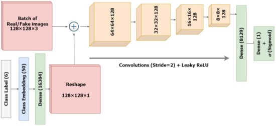 The standalone discriminator model is designed as in Figure 6 to investigate the likelihood that the input image is real. Technically, it is a binary classifier deciding values between 1 and 0 using a sigmoid activation. Unlike regular GANs, here we are also providing several classes as input. The input images along with their skin lesion class labels are supplied as input to the discriminator. Similar to the generator, the discriminator also establishes embeddings for the class labels, which are then upscaled to the input image dimension of 128 × 128 with linear activations. Further, these are concatenated as an additional channel with the original input image. The classifier is designed to downsample the input embeddings of the combined representations four times, followed by a flattening layer and a dropout of 40% for regularization. Here again, we integrate the input label and image while defining the model inputs as performed in the generator. The sigmoid activation functions ensure sparse categorical values, representing real and fake data. The ground truth labels of the incoming images would always be set as real , regardless of whether they were batches of real or synthesized images. Eventually the generator tries to improve the possibility that the discriminator would misinterpret its inputs for genuine while the discriminator would want to accurately distinguish false as fake and real as real. However, the model is compiled before connecting it with the generator architecture.