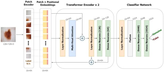 Transformers utilize a clever positional encoding approach in which each position or index is mapped to a vector. As a result, the positional encoding layer produces a matrix in which each row represents one encoded object in the sequence aggregated with its positional information. To maintain positional information, position embeddings are added to patch embeddings. To the series of embedded patches, we append a learnable embedding for the class label (real/fake), whose state at the Transformer encoder’s output would serve as the representation y’ to be extrapolated using a classifier head.