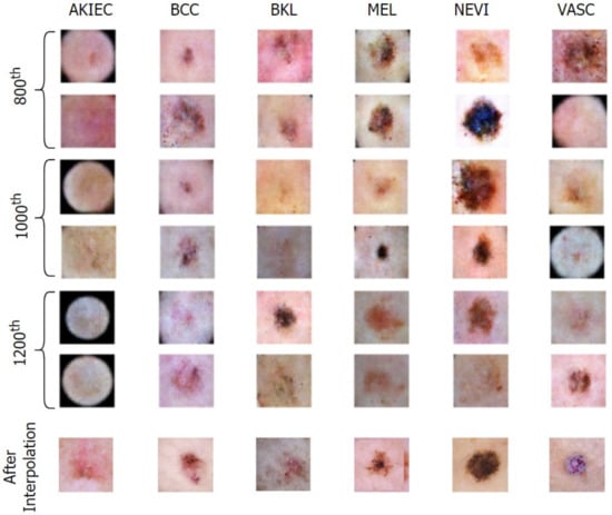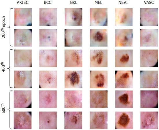 Figure 8 and Figure 9 exhibit the progressive learning activity of the generator captured every 200 epochs. The conditional generator could seamlessly produce data points (fake dermatological conditions) based on the label corresponding to the skin lesion disease. It must be due to the human hair structures in the original image that the final synthesized images had a few missing pixel points (black dots). To remove the pixelated black noise, we performed localized interpolation based on thresholds on the outputs from the generator. The thresholds were set to near black point pixel values in the normalized ranges.