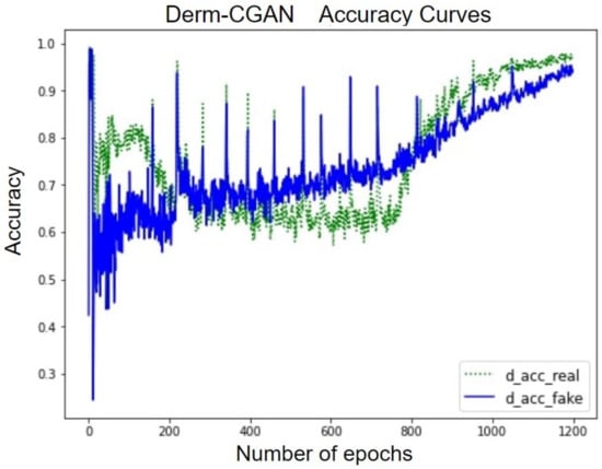 The accuracy curve of the discriminator over the real and fake classes helps explain the performance of Derm-CGAN (Figure 10). Though the learning process is quite disturbing, both detection accuracies have not gone below chance values after the initial 100 epochs. Furthermore, discriminating between real and fake has reached a tipping point in the final stages of learning. The accentuating curves demonstrate how the discriminator was able to clearly distinguish between the two classes. Both accuracies at the last epoch were estimated to be 98.43% and 96.79%.