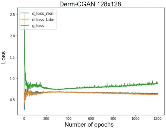Initially, we started the training of Derm-CGAN with the conditioned generator by pumping in noise vectors and skin class label inputs to produce 128 × 128 × 3 fake samples with the class label 0. We loop through a number of epochs to train our discriminator by first selecting a random batch of n real images from the real dataset. Further, a set of n images is produced from the still-learning generator. Both sets are fed to the discriminator to initiate training. Finally, the loss parameters are distinctly set and back-propagated for both the real and fake images (Equations (3) and (4)). Alongside this, a combined GAN loss comprehends the convergence rate of the framework.