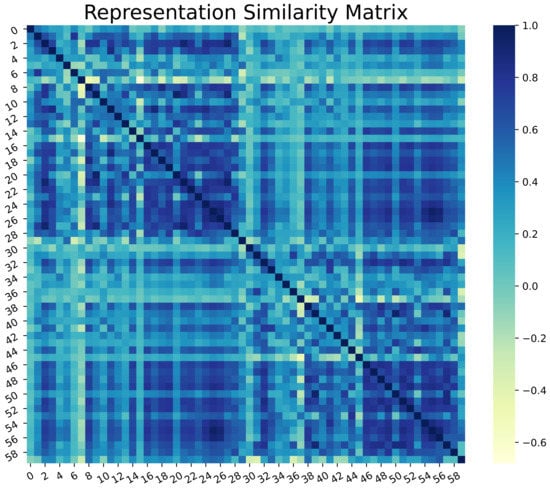 We randomly selected 30 samples from each of the classes (real and fake) for the analysis. Each image was reshaped to a resolution of 200 × 200 and flattened. The rationale behind this is to project each image to a data point of dimension 40,000 for easier comparison. We find the Pearson correlation coefficients between all pairs of data points in the shared representational space. Equations (5) and (6) show the computations involved.