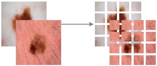 We omitted the ViT64/32 and the ViT32/16 variants, as patching would produce only 4 large patches. The rest of the model settings were assessed in terms of the aforementioned metrics. We trained the ViT frameworks for 100 epochs with a batch size of 10. The entire dataset was split for training and testing in the ratio 75:25. Of the 75% training data, 30% was randomly selected for validation in each epoch, thereby ensuring cross-validations during the training phase. Further, we applied Normalization, Random Horizontal Flip, Random Rotation of 20%, and Random Zoom of 20% augmentations to regularize our training on varied data. Each image was then patched depending on the ViT variant chosen. Figure 13 shows the patching of a random skin lesion on ViT128/32