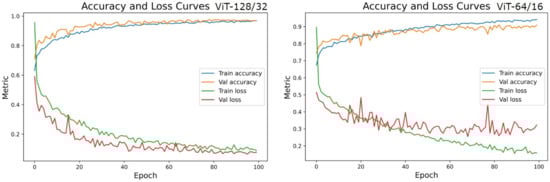 Accuracy and Loss curves of the two top performing model settings-ViT128/32 and ViT64/16.