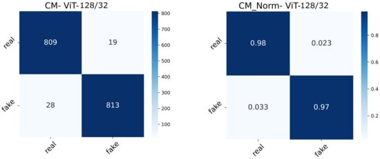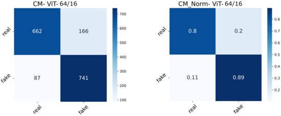 The real-valued and normalized confusion matrices of the two ViT variants show the proportion of each category classified (Figure 15 and Figure 16). The best-performing model could capture better attention representations, hence the higher percentages of True Positives and True Negatives. ViT64/16 has captured attentive features from the real image class, depicting a higher number of False Negatives (real being classified as fake) compared to False Positives (fake being classified as real).