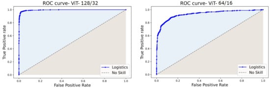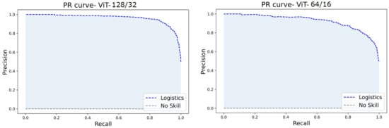 The ROC and PR curves for the predictions at various categorization thresholds are illustrated in Figure 17 and Figure 18. The trade-off between the true positive rate and false positive rate was summarised by ROC curves, whereas the accommodation of the true positive rate and the predicted positives was summarized by the PR curve. The larger number of True Negatives by ViT64/16 causes the ROC and PR curves to fall at the x-axis. Moreover, the AUC sheds light on the competence of a predictive model. An AUC of 99.54% was computed for ViT128/32, and for other variants, it covered over 96.00% through 98.00%.