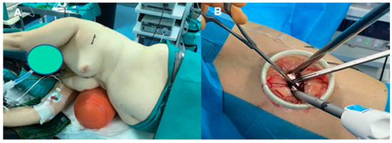 Figure 2. (A): Patient positioning during left VATS with an inflatable roll behind the contralateral side; (B): instrumentation: during most of the procedure, the camera is at the top of the incision and uniportal instruments and endo-staplers are at the bottom [42].