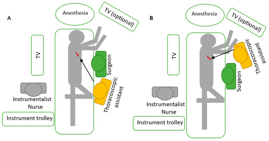Figure 4. Position of the surgeon, camera assistant and scrub nurse. (A) The assistant stands caudally to the surgeon during most steps of the procedure; (B) for certain steps in the lower part of the chest, the assistant stands cranially to the surgeon to avoid constant collision with his instruments [64].
