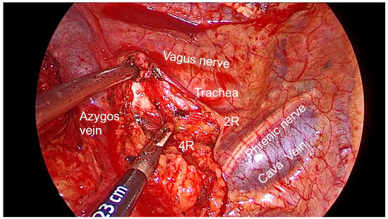 • Procedure: First, divide the mediastinal pleura at the intersection of the azygous vein with the superior vena cava. Retracting the pleura with the suction and energy device, continue dividing the pleura over the azygous vein between the vagus nerve in the left and the superior vena cava. Next, using suction or a grasper, start removing all the fat and lymph nodes en bloc along the anterolateral side of the trachea, just below the caudal edge of the right brachiocephalic artery. Sometimes, the phrenic nerve runs more lateral to the superior vena cava and not over it; before deepening the dissection towards the posterior aspect of the superior vena cava, it is necessary to check the position of the nerve to avoid accidental damage. The most common complication of a complete paratracheal dissection is chylothorax, or bleeding from small vessels.