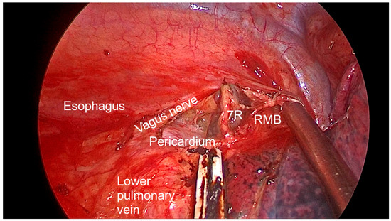 Figure 6. Anatomic landmarks during right subcarinal lymph node dissection (7R). RMB—right main bronchus.