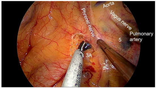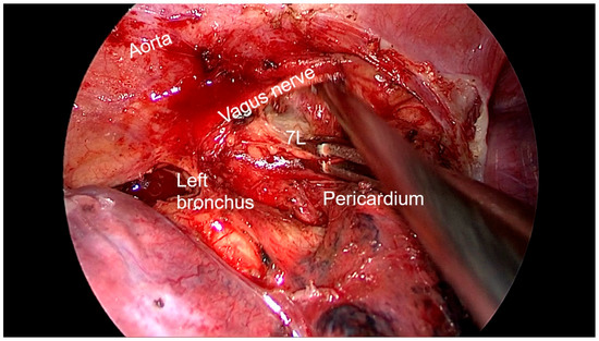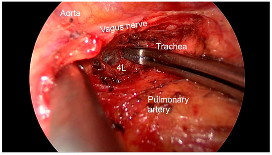 • Procedure: The left paratracheal station is placed deep inside the aortopulmonary window and is a surgical challenge for systematic lymph node dissection. The recurrent laryngeal nerve can be damaged, and, in some cases, the ligamentum arteriosum can hinder exposure. Station 4L can be easily reached and excised up to the point of visualising the left side of the trachea and left main bronchus. The dissection starts at the main bronchus under the aorta and continues until the left tracheobronchial angle is reached. Some authors recommend avoiding energy devices to prevent neural damage [71,72].