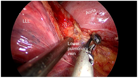 • Procedure: It is possible to dissect this area with the assistant standing to the right of the surgeon. After initial division of the mediastinal pleura above the upper lobe vein, dissect the fat tissue and lymph nodes that are below the aortic arch and posterior to the phrenic nerve. By using a sponge stick, gently retract the upper lobe caudally. The assistant can hold both the suction and the grasper, allowing the surgeon the possibility of bimanual dissection.