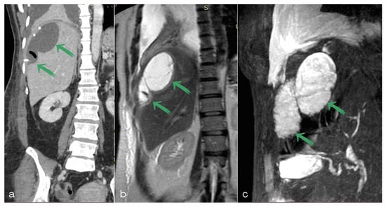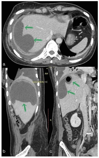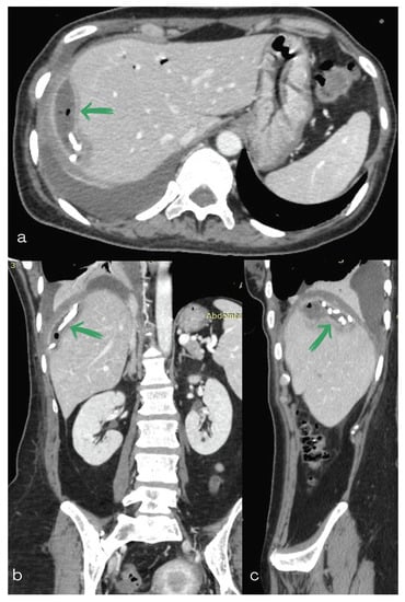 (a,b) Computed tomography scan of the abdomen: (a) axial, (b) sagittal and (c) coronal section showing a subcapsular collection as well as a rounded water-attenuation fluid collection with an air–fluid level in contact with the previous one (green arrows).