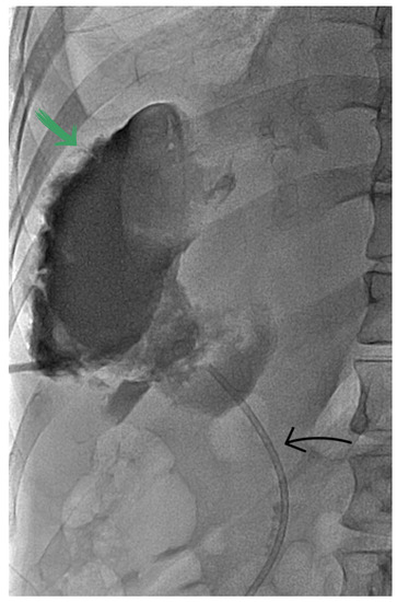Contrast opacification of the subcapsular collection through the 8F pigtail catheter (green arrow). Previously placed stent in the common bile duct (black arrow).
