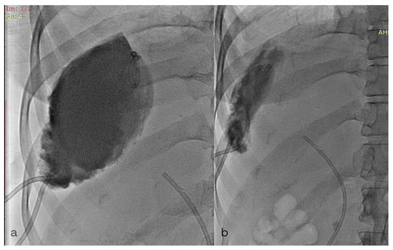 (a,b) Contrast opacification of the subcapsular collection through the 8F pigtail.