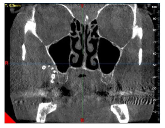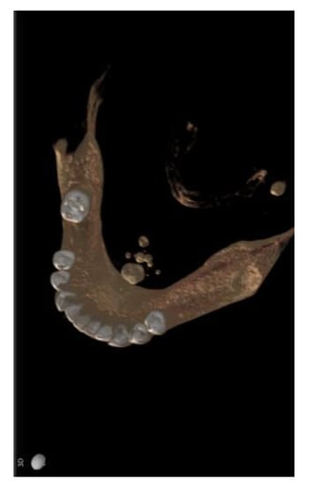 In the second case (MR), a 67-year-old Italian female patient went to a private dental studio in Badia Polesine (Rovigo) for a routine check in mid-January 2021. Her remote and recent medical history revealed hypertension compensated for with medical drugs, previous mild episodes of gastritis, and the use of statins for cholesterol balancing. During the visit, the patient did not describe any problems of dental interest. Upon inspection of the perioral and extraoral soft tissues, small masses with smooth surfaces of varying sizes were found on palpations in the thickness of the right cheek in the subzygomatic area, which was not painful, if not under extreme compression. No decrease in parotid function was reported or noted. In order to deepen the investigation and complete the visit, OPG was performed (Figure 5) and revealed the appearance of multiple rounded masses mixed with radiopaque radiolucent. At this point, further questions were asked regarding any specific examinations of the salivary glands performed in the past, and we were told that a sialography was performed (according to the patient) at least 20 years ago, which she had partially forgotten. It was not possible to trace further information regarding the timing or method of the alleged and hypothesized sialography. At the specific request of the patient herself, for in-depth diagnostics, a low-dose CT scan was performed. It showed these masses with higher resolution in terms of their location and internal/external features (Figure 6, Figure 7 and Figure 8).