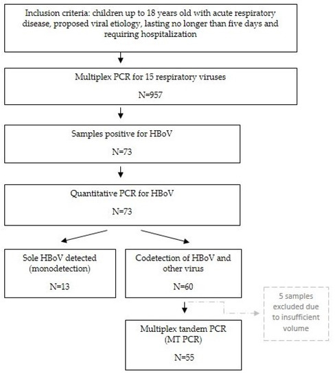 - Samples with a high concentration of HBoV (more than 104 copies/mL in quantitative PCR of and a low score of other viruses (intensity 1–3 stars on MT-PCR);