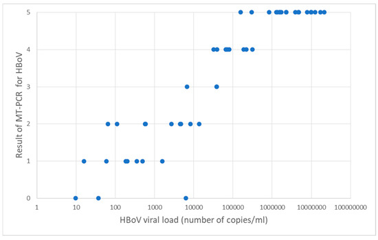 - Samples with a high concentration of HBoV (more than 104 copies/mL in quantitative PCR) and a high score of other viruses (intensity 4–5 stars on MT-PCR);
