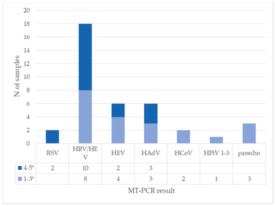 Next, the quantitative nature of MT-PCR potentially allows us to compare relative quantity of viruses in cases of co-infection. We analyzed the amount of other viruses in samples with HBoV to see if there is a difference between samples with high and low HBoV concentrations. In 28 samples with a high concentration of HBoV on quantitative PCR (more than 104 copies/mL), four viruses were present in a high amount (marked with 4–5 stars on MT-PCR): RSV, human rhinovirus, human enterovirus, and human adenovirus. Other viruses were detected in small concentrations (marked 1–3 stars on MT-PCR). The results are presented in Figure 4 and Figure 5.