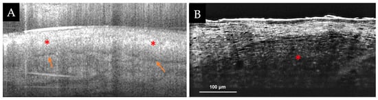 (A,B) Optical coherence tomography (OCT) images of tumor nodules (red asterisks) with clefting (orange arrows) from the BCC shown in Figure 1A acquired with (A, at left) an RCM-OCT probe, and (B, at right) high-resolution OCT device. Field of view: (A) = 2 × 1 mm; (B) = 500 × 400 µm. Images (A,B) courtesy of Ms. Rozina Zeidan, Clinical Research Specialist, Memorial Sloan Kettering Cancer Center.