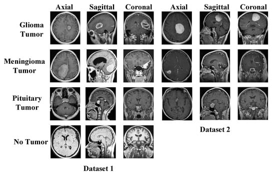We have used two datasets in this research to show the general classification ability of the proposed model. The used both datasets are publicly available, and these are brain tumor datasets. These datasets were downloaded from Figshare and Kaggle platforms. There are three classes in the Figshare dataset, and the Kaggle dataset has four classes. Therefore, we used Kaggle Dataset for training. Sample images of these datasets are demonstrated in Figure 1.