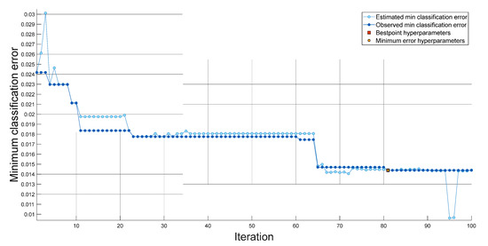 Within the scope of this research, we implemented the INCA, SVM, and bayesian optimization methodologies to develop a novel feature engineering model. We achieved good classification performance by utilizing a shallow SVM classifier in conjunction with our feature engineering model. The hyperparameters of the fine-tuned SVM obtained with 100 iterations for a dataset I are shown in Figure 6. The hyperparameters of the fine-tuned SVM obtained with 100 iterations for Dataset II are shown in Figure 7. The hyperparameters used for datasets I and II are tabulated in Table 2.