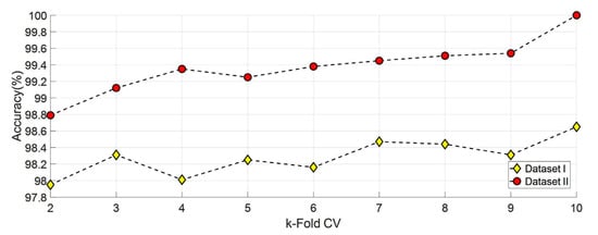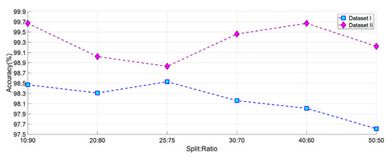 Different options were tested to decide which split: ratio or k-fold CV to use. First, classification is completed using SVM for datasets I and II from 2-fold CV to 10-fold CV. Obtained results are shown in Figure 8. In addition, datasets I and II were classified using SVM using six different split: ratio ratios In the literature, studies were carried out using different split ratio ratios [46,47,48,49,50,51,52,53,54,55]. The accuracy values obtained with the split ratio ratios of 10:90, 20:80, 25:75, 30:70, 40:60, and 50:50 are shown in Figure 9. As a result, ten- fold CV for Dataset I and dataset II has been chosen in this study because it gives the highest accuracy value.