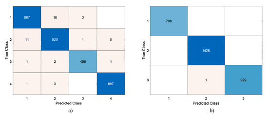 124,800 features were obtained from DenseNet201 with the help of 28 × 28 patches. These features are selected with the help of INCA. With INCA, 231 features were selected for Dataset I, and 220 features were selected for Dataset II. The selected features were classified by running 100 times with SVM 10 fold CV. Confusion matrices of the highest accuracy achieved are shown in Figure 10.