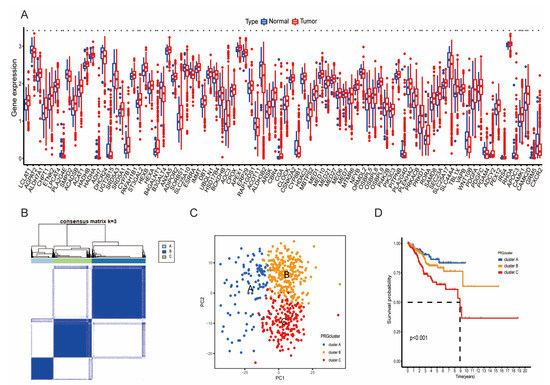 Identification and clustering of LMRGs: (A) expression of 88 DE-LMRGs between the UCEC samples and normal samples. * p < 0.05, ** p < 0.01, and *** p < 0.001. (B) Consensus clustering map of NMF clustering, and the optimal cluster number was three (k value = 3). (C) Principal component analysis (PCA) showed that the three clusters in the consensus clustering approach were robustly segregated. (D) Kaplan–Meier curve survival (K–M) analysis of patients in the three clusters, and patients in Cluster A had a better prognosis. p < 0.001.