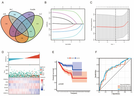 Constructing the LMR-FAG-related risk score. (A) Venn diagram showing lipid-me tabolism-related and ferroptosis-associated genes (LMR-FAGs). (B,C) LASSO coefficient profiles and cross-validation were used to identify LMR-FAG-related genes. (D) Distributions of risk scores, survival status, and expression levels of six prognostic genes in UCEC. (E) The K-M survival analysis demonstrated that patients in the low-risk group had a better prognosis. p < 0.001. (F) Time-dependent ROC curve and AUC of the prognostic signature in UCEC patients from TCGA.