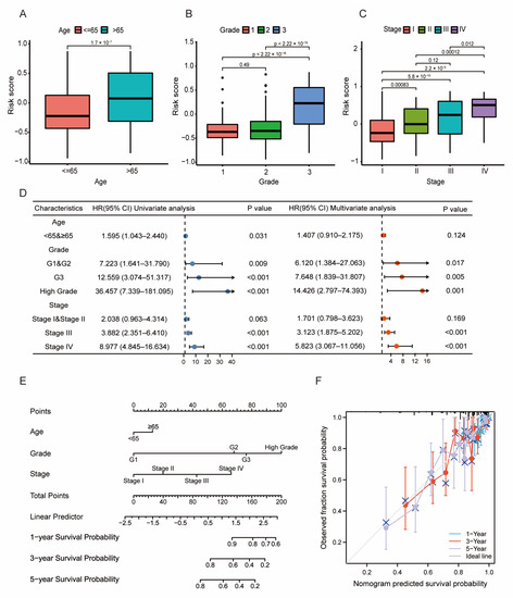 Establishment of a predictive nomogram. (A–C). The pathological characteristics age, grade, and stage in the high- and low-risk groups. Patients in the high-risk group had an older age and higher grade and stage. (D) Univariate and multivariate Cox regression analyses of the signature and clinical characteristics. (E) Nomogram to predict 1-year, 3-year, and 5-year overall survival times. (F) Calibration curve to assess the accuracy of the nomogram. The C-index was 0.767 (0.741–0.793).