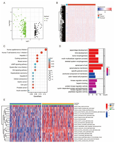 To investigate the relationship between the six genes in the risk model, we constructed a protein–protein interaction (PPI) network (Figure S4A) and analyzed the correlations (Figure S4B). The results showed that PSAT1 and RSAD2 were more independent and less associated with other genes. Next, a volcano plot and heatmap showed the DEGs between the two risk groups; 81 genes were upregulated and 195 genes were downregulated (Figure 4A,B). The PPI network of the DEGs is depicted in Figure S4C. To reveal the underlying biological characteristics associated with the risk scores, KEGG and GO analyses were performed based on DEGs between the high- and low-risk groups. The results indicated that pathways such as kinase and peptidase regulation, apparatus morphogenesis, cell cycle regulation, viral infection, and antiviral innate immune response were highly enriched (Figure 4C,D, p < 0.05). In addition, we performed GSVA to probe differences in pathways between the two risk groups. As illustrated in the heatmap in Figure 4E, pathways related to lipid metabolism and ferroptosis, such as “tyrosine metabolism”, “fatty acid metabolism”, “alpha linolenic acid metabolism”, and “DNA replication”, were significantly enriched (p < 0.05).