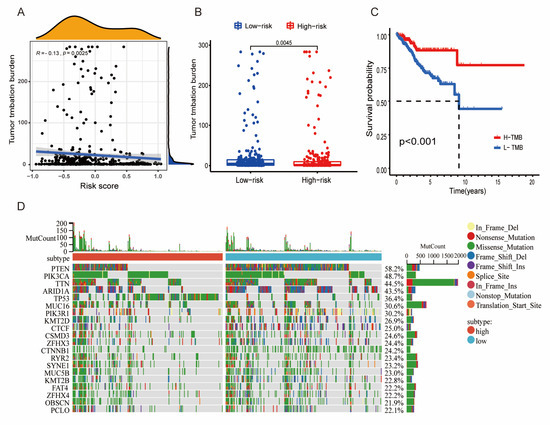 Relationship between the tumor mutational burden (TMB) and the risk model. (A) Relationship between TMB and risk score. TMB was negatively associated with risk score. (R = −0.13, p < 0.05). (B) The result showed that patients in high-risk group had lower TMB levels. p < 0.05 (C) The K-M analysis presents the difference in overall survival between the low- and high-TMB groups. In addition, patients with high TMB had a better prognosis, p < 0.05. (D) The waterfall plot shows the mutation information of the top 20 genes in each UCEC sample.