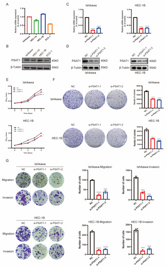 The risk gene PSAT1 promotes UCEC cells’ proliferation, migration, and invasion. (A,B) mRNA and protein levels of PSAT1 were measured by qPCR and Western blotting in four UCEC cell lines. (C,D) The efficiency of the knockdown of PSAT1 in Ishikawa and HEC-1B cells were measured by qPCR and Western blotting. (E,F) CCK-8 and colony formation assays showed that the proliferation ability of UCEC cells was decreased after PSAT1 knockdown. (G) The transwell assay showed that the migration and invasion capacities of UCEC cell lines were inhibited after PSAT1 knockdown. * p < 0.05, ** p < 0.01, *** p < 0.001, **** p < 0.0001.