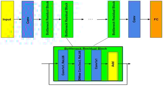 MobileNetV2, illustrated in Figure 7, is a new version of MobileNetV1 [30]. Therefore, MobileNetV1 is based on depthwise separable convolution in the first layer to reduce the complexity cost and model size of the network, and a convolution in the second layer was used for building new features through computing linear combinations of the input channels. On the other hand, MobileNetV2 used two types of blocks. One is a residual block with a stride of 1, and the other one is a block with a stride of 2 for downsizing. They employed 3 layers for both types of blocks, but they started with the layer of convolution with ReLU6. After a layer of depthwise convolution was applied, the last layer was convolution but without any non-linearity.
