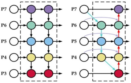 where is usually upsampling and downsampling operation and is usually a convolution operation for feature processing. Top-down FPN is inherently limited by the one-way information flow. To address this issue, BiFPN integrates bidirectional cross-scale connections [32,33,34]. The cross-scale connection’s intuition is a node that has one input edge with fusion features having more contribution than the input edge with no feature fusion, adding an extra edge from the original input to the output node if they are at the same level and treating each bidirectional (top-down and bottom-up) path as one feature network layer and repeats the same layer multiple times to enable more high-level feature fusion. Furthermore, a depthwise separable convolution was adopted [35] for feature fusion and batch normalization and activation were added after each convolution to further increase efficiency.