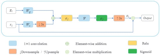 In this section, for each decoder layer Di, each deconvolution block named starts with a block of attention followed by an upsampling to increase the dimension and a double convolution block in the end. A double convolution block contains two convolution layers. It consists of a batch normalization layer and is activated by the activation function, ReLU. The last features obtained in global specific features will play the bottleneck role; then, four decoder layers will be obtained after each , and a final output block that contains a convolution layer will be affected to obtain the segmented image with a different type of tumor. Adding an attention mechanism to our decoder generates layers containing more pertinent and deeper feature representation, and it pays attention to a small region of a brain tumor which improves the segmentation effect of brain tumors. Attention blocks or attention gates (AGs) are inspired by human mechanism attention which naturally concentrates on the region of interest and develops the ability to suppress unnecessary feature responses in feature maps while highlighting significant feature information critical for a specific task. The basic schematic of the attention gate is illustrated in Figure 10.