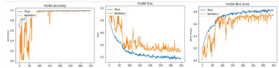 Accuracy, loss, and dice score of training and validation subsets in terms of the number of epochs from the BraTS 2020 training dataset.
