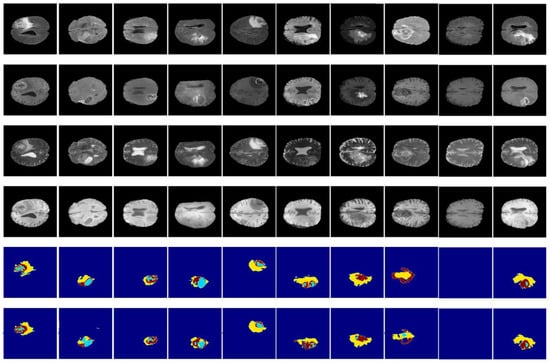 Qualitative results obtained from the validation subset of the BraTS 2020 training dataset. From up to down: flair, t1ce, t1, t2, ground truth, and prediction.