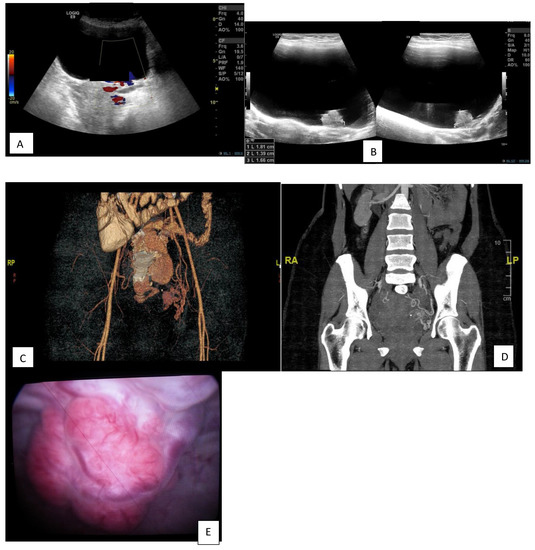 - Rosenberg, J.; Golimbu, M.; Suarez, J.; Morales, P. Congenital Arteriovenous Malformation of the Bladder. J. Urol. 1973, 109, 605–608. [Google Scholar] [CrossRef]