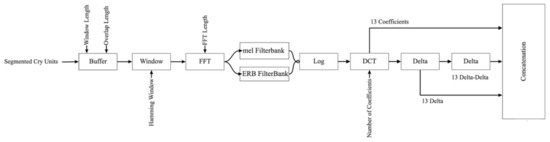 The extraction of appropriate acoustic features capable of pertinent signal representation plays a vital role in any audio classification problem. As discussed above, for the effectuation of a cry, glottal impulses proceed through the filtering carried out by the vocal tract [59]. With the aim of distinguishing between the source and filter of a cry, cepstral analysis employed, which enables a homomorphic transformation [60]. MFCCs were derived from the Mel Filter Banks, whereas GFCCs were obtained from the Gammatone Filter Banks, which are a representation of inner and external middle ear physiological transitions [61]. In other words, although the two approaches are based on from the human sound perception model, the GFCCs are coordinated to comprehend the physical alterations more effectively than the MFCCs, and better delineate the auditory system [62]. Both Gammatone and Mel-frequency representations of the cry signal were mapped into the cepstrum space for the feature extraction step. Figure 2 illustrates our framework; the proposed steps for the acquisition of each of these features are described in the following sections.